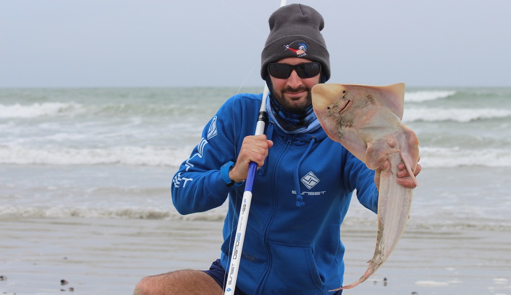 Le second lancer se fait à la même distance, et en seulement 3 minutes, c’est une nouvelle touche. Frédéric laisse tremper en espérant un doublet ou un triplet qui sait ! Cela se soldera par un doublet au bout de 7 minutes, tandis que les voisins ne feront qu’un poisson au mieux. C’est un autre doublet peu après qui amènera le score à 5 poissons pour Frédéric à marée basse, puis plus rien. Il faudra attendre que la mer remonte pour retrouver un peu d’activité. Durant la marée montante, ce seront 11 raies guitares qui viendront s’ajouter à la pesée, pour un total de 17 poissons et 13 kg. C’est une belle place de 3e/20 et 14e de la manche à la clé.