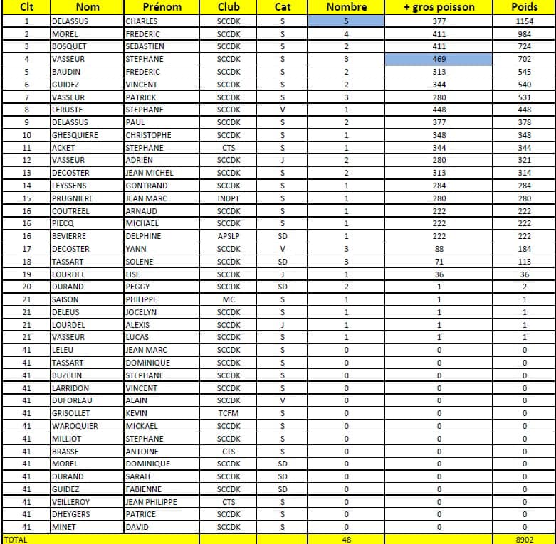 A l’issue des 4h, c’est Charles DELASSUS du SCCDK qui s’impose avec 5 prises pour 1.1 kg, suivi par Frédéric MOREL puis par Sébastien BOSQUET pour compléter le podium. Classement complet :