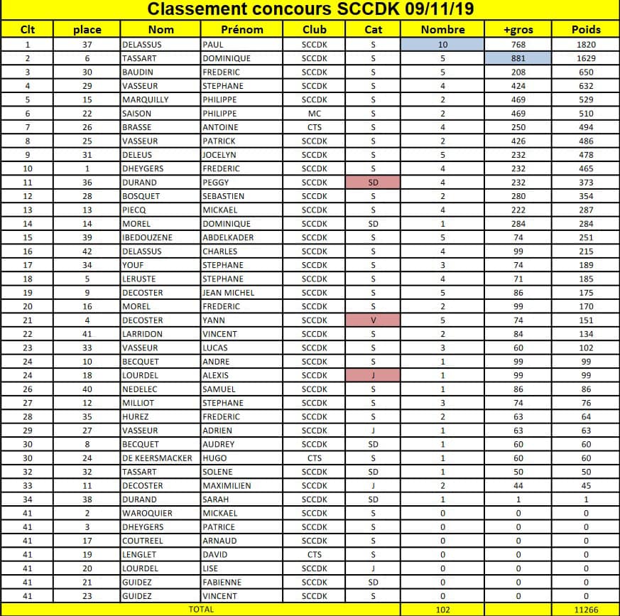 Plus de 100 prises ont été comptabilisés pour un poids total converti de 11 kg, ce qui reste faible malgré une légère amélioration en comparaison en début de saison. A l’issue des 4h de compétition, c’est Paul DELASSUS qui l’emporte avec le plus grand nombre de poissons (10), pour un poids total de 1.8kg, suivi de Dominique TASSART, et Frédéric BAUDIN pour compléter le podium.