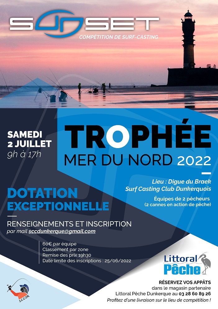 Le SCCDK lance la toute première édition du trophée Sunset MER DU NORD le samedi 2 juillet 2022 sur la mythique digue du Braek de Dunkerque. A cette période estivale, les bars, flets, soles, chinchards, maquereaux et mulets sont attendus !