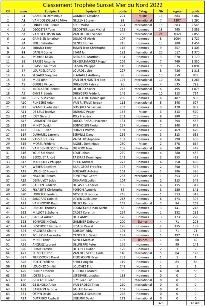- Plus grand nombre : 21 prises pour VAN PIETERSON JAN & VAN DER REE Sander