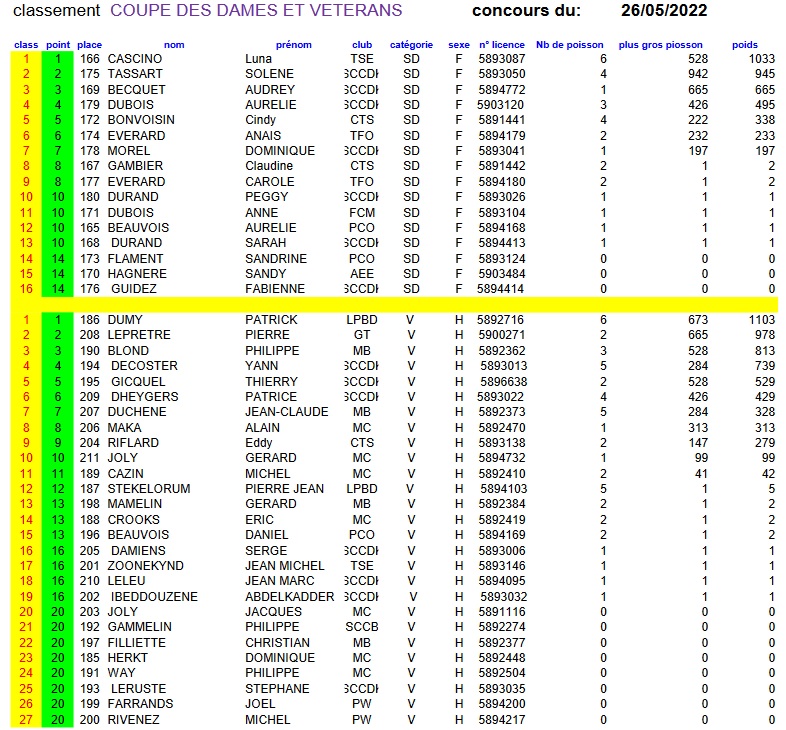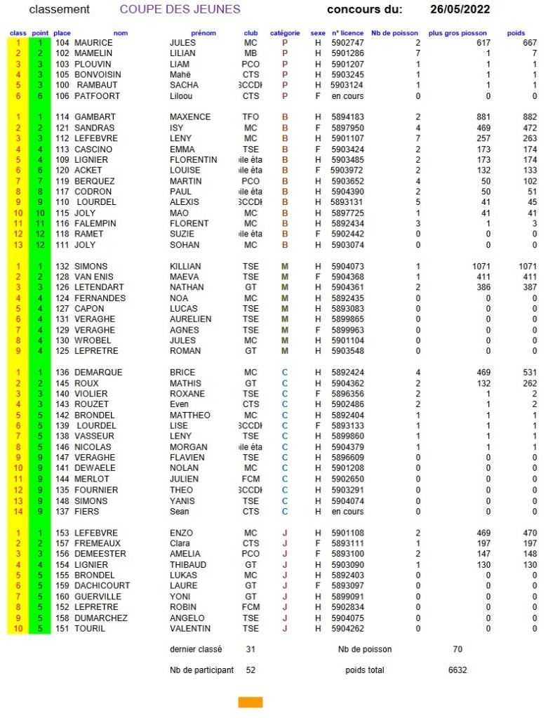 A l’issue des 4h de pêche, ce sont 147 prises qui ont été comptabilisées pour un poids total théorique converti de 16 kg. Le plus gros poisson de l’épreuve est un bar de 47 cm à mettre à l’actif de Killian SIMONS du TSE, tandis que le plus grand nombre de prises enregistrées revient à Lilian MAMELIN des MArsouins Boulonnais et Leny LEFEBVRE des MArsouins de Calais avec 7 poissons chacun.