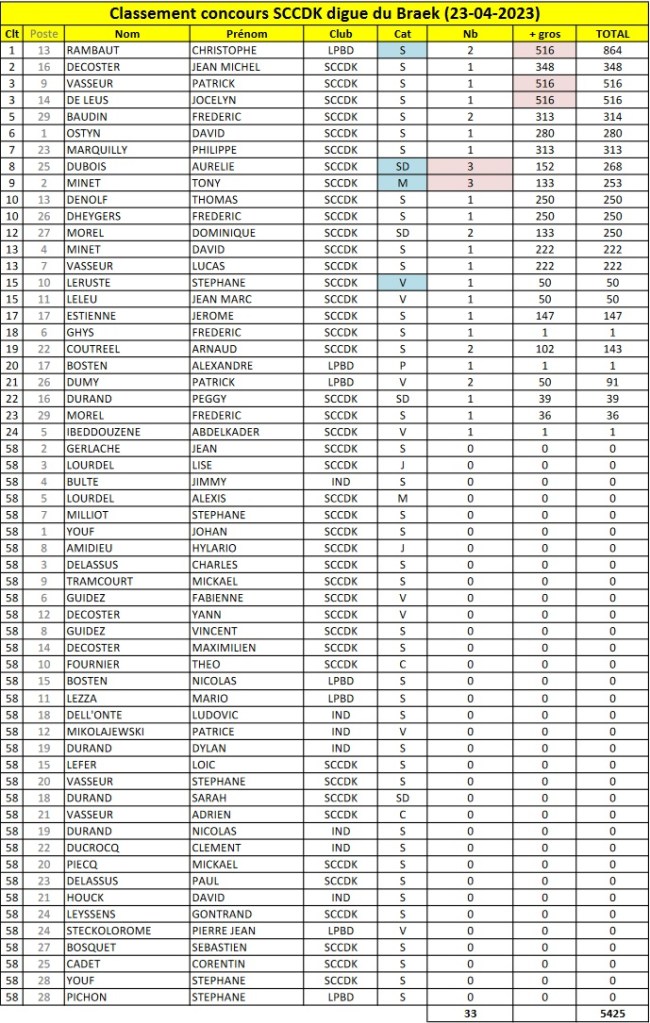 A l’issue des 4h de compétition, seuls 33 prises (essentiellement des flets) auront été mesurés pour un poids théorique converti de 5.4 kg de poissons. Le plus gros poisson du concours est un flet de 35 cm, tandis que le plus grand nombre se limite à 3 prises.
