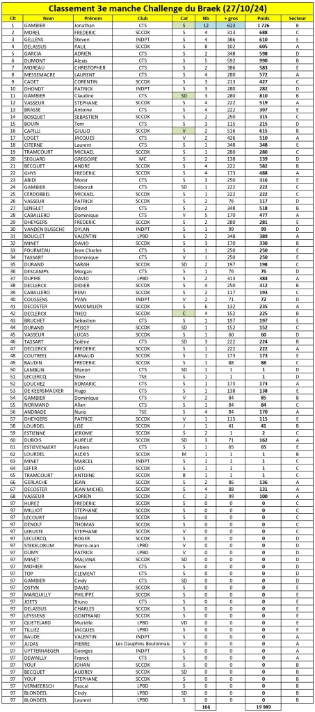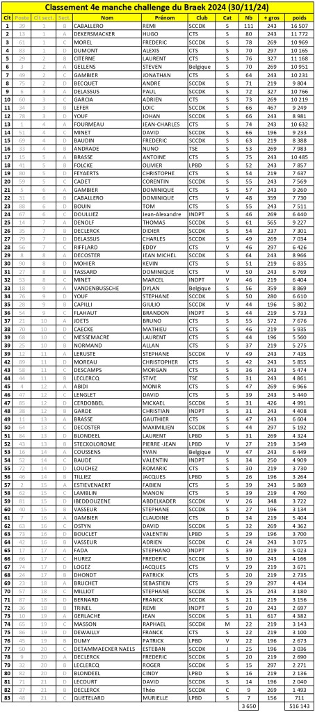 La remise des prix générale du Challenge du Braek 2024 s’est tenue dimanche 15 décembre, à 14h30, Bourse aux associations, Rue du 11 Novembre 1918, 59140 Dunkerque. Elle était précédée par la remise des prix de la 4e manche, qui n’avait pu avoir lieu à l’issue du concours, tellement il y avait de poissons à enregistrer (+3500€) !
